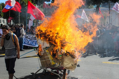 We joined up with students from other universities in the city at one of the main roundabouts in the city, one that is typically whizzing with traffic but today was swamped with students. At least for me, an accurate count of the participants was impossible, but it was certainly multiple thousands. From there, we turned back toward campus. On O’Higgins, one of the city’s main streets, the protestors dumped a papier-mâché pig that had been constructed on top of a shopping cart and lit it on fire. Soon, an effigy of Michelle Bachelet, Chile’s current president, was piled on, along with another effigy I didn’t recognize. One student must have thought he was pretty cool as he lit a cigarette in his mouth from the flames, but he nearly lost his hair when the wind quickly shifted.