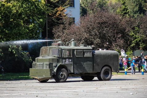 Un guanaco, a water cannon truck, spraying protesters on the UdeC campus.