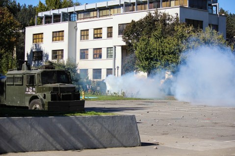 We still needed to pick up our backpacks at the far end of the campus, so we walked down the main street on the west side of campus. Here, though, we had to pause at a street corner because a guanaco was driving in circles spraying protestors who were pelting it with rocks. Wearing bandanas over their mouths and noses, the protesters would approach the truck, launch their rocks, and run as it turned to spray them.